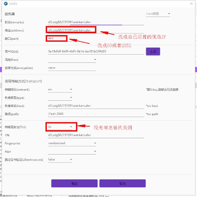 在v2rayN导入URL,地址栏改为优选ip,secrurity为pls,端口配置443,host为解析的域名地址,
